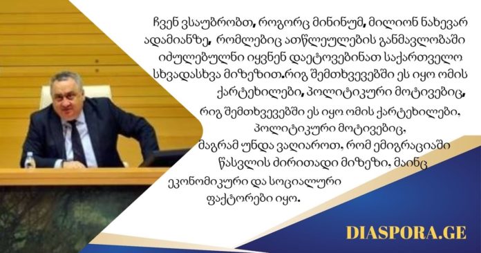 ქართულმა ემიგრაციამ უნდა იცოდეს, რომ ჩვენი ხელისუფლება, როგოც საკანონმდებლო, ისე აღმასრულებელი, ადასტურებს, რომ ეს ქვეყანა გულწრფელად მზადაა და სამშობლოს კარი მუდამ ღიაა მათთვის, ვისაც სურვილი და მონდომება გააჩნია დაბრუნდეს საქართველოში.