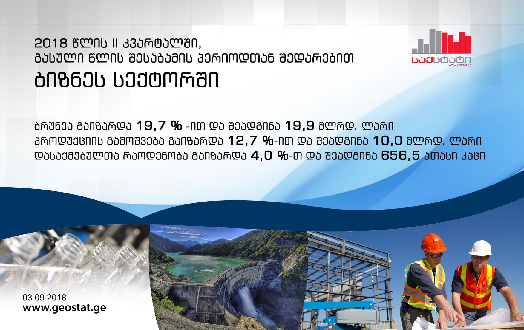 2018 წლის II კვარტალში ბიზნეს სექტორში დასაქმებულთა საშუალო რაოდენობა 656,5 ათასი კაცით განისაზღვრა, რაც გასული წლის შესაბამისი პერიოდის მაჩვენებელს 4 პროცენტით აღემატება.