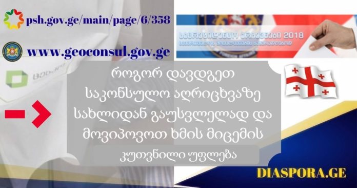 საზღვარგარეთ მყოფი საქართველოს ნებისმიერი მოქალაქე უფლებამოსილია დადგეს საკონსულო აღრიცხვაზე სახლიდან გაუსვლელად. საკონსულო აღრიცხვაზე დასადგომად იუსტიციის სახლის ვებ-გვერდის ამ მისამართზე- http://psh.gov.ge/main/page/6/358 შესაძლებელია შეავსოთ ელექტრონული განცხადება, ატვირთოთ თქვენი ბიომეტრიული ფოტოსურათი, დაუკავშირდეთ დისტანციური მომსახურების სამსახურის ოპერატორს და პირდაპირი ელექტრონული კომუნიკაციის რეჟიმში გამოხატოთ თქვენი ნება საკონსულო აღრიცხვაზე დადგომასთან დაკავშირებით.