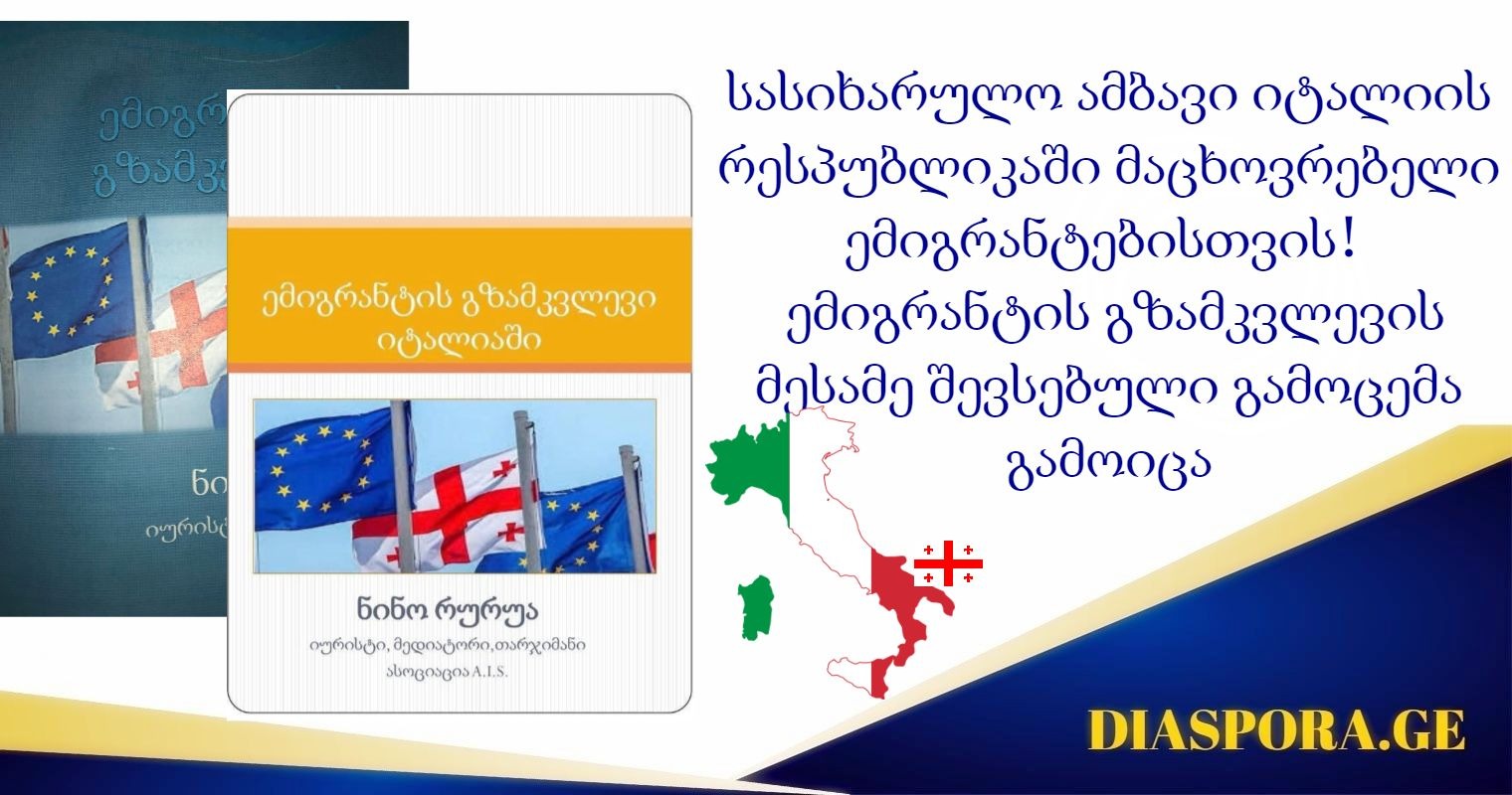 სასიხარულო ამბავი იტალიის რესპუბლიკაში მაცხოვრებელი ემიგრანტებისთვის – ემიგრანტის გზამკვლევის მესამე შევსებული გამოცემა გამოიცა,რომელიც იტალიის ქართული დიასპორის აქტიური და ცნობილი წარმომადგენლის, ასოციაცია A.I.S. და ქართული საკვირაო სკოლის დამფუძნებელის, იურისტის, იტალიის სასამართლოს მიერ აღიარებული მედიატორის და თარჯიმნის ნინო რურუას ინიციატივით და მისივე უშუალო თარგმანით გამოიცა.