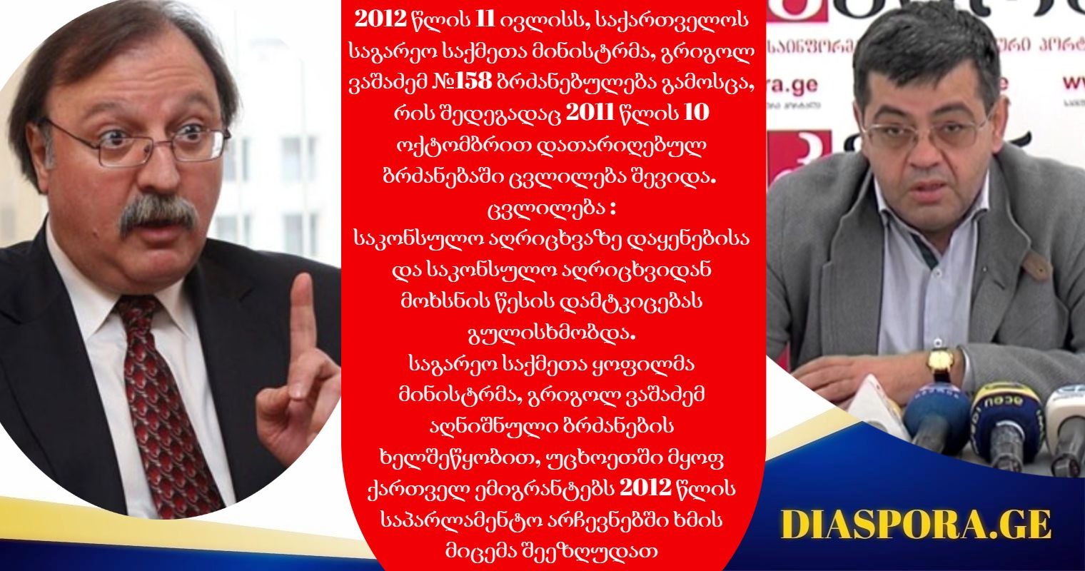 საბერძნეთში მოღვაწე ქართველი ბიზნესმენი და დიასპორული ინვესტიციების მხარდამჭერი ასოციაციის პრეზიდენტი, და საერთაშორისო ორგანიზაცია ,,ემიგრანტები დემოკრატიული საქართველოსთვის ” დამფუძნებელი გიორგი ოკრიბელაშვილი საზღვარგარეთ მცხოვრებ საქართველოს მოქალაქეებს 2012 წლის 11 ივლისს, საქართველოს საგარეო საქმეთა მინისტრის და დღეს პრეზიდენტობის კანდიდატის, გრიგოლ ვაშაძემ მიერ გამოცემულ ბრძანებულება №158 ახსენებს და აცხადებს რომ განცხადებით დღემდე გრიგოლ ვაშაძის ბრძანებულებით ეზღუდებათ უცხოეთში მყოფ ქართველ ემიგრანტებს არჩევნებში ხმის მიცემის უფლება: ,,მივმართავ ემიგრანტებს, განსაკუთრებით, საბერძნეთის დიასპორას… რა დაგემართათ, ნუთუ დაგავიწყდათ 2012-ში რა ქნა ზუსტად ამ გრიგოლ ვაშაძემ, 28 ოქტომბერს რომ სიებში არ ყოფნას სამართლიანად აპროტესტებდით, არ გახსოვთ, რომ ზუსტად ბ-ნ გრიგოლ ვაშაძის მინისტრობის დროს მისი ხელმოწერილი ბრძანების საფუძველზე ათასობით არალეგალ ემიგრანტს საკონსულო აღრიცხვის გასავლელად მოსთხოვეს ადგილსამყოფელ ქვეყანაში ლეგალური საცხოვრებელი ადგილის ცნობა?! შემთხვევით, ისიც ხო არ გავიწყდებათ, რომ სწორედ გრიგოლ ვაშაძემ მოაწერა ემიგრანტებისთვის ავადსახსენებელ რეადმისიის ხელშეკრულებას ხელი?!” – წერს გიორგი ოკრიბელაშვილი.
