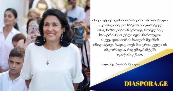 დამოუკიდებელი საპრეზიდენტო კანდიდატი სალომე ზურაბიშვილი დიასპორის წარმომადგენლებს მიმართავს. მიმართვა სალომე ზურაბიშვილის Facebook-ის გვერდზე გავრცელდა. ზურაბიშვილი აცხადებს, რომ პრეზიდენტად არჩევის შემთხვევაში დიასპორის წარმომადგენლების ინტერესების დამცველი იქნება.